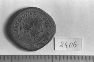 Recto: testa laureata di M. Aurelio, a destra . Contorno di perline.\nVerso: Salus, drappeggiata, stante di frnote, rivolta a sinistra, con patera nella destra nutre il serpente che sale, avvolgendo le spire, dall'altare a base circolare, a sinistra, tenendo lo scettro verticale nella sinistra. Contorno di perline.