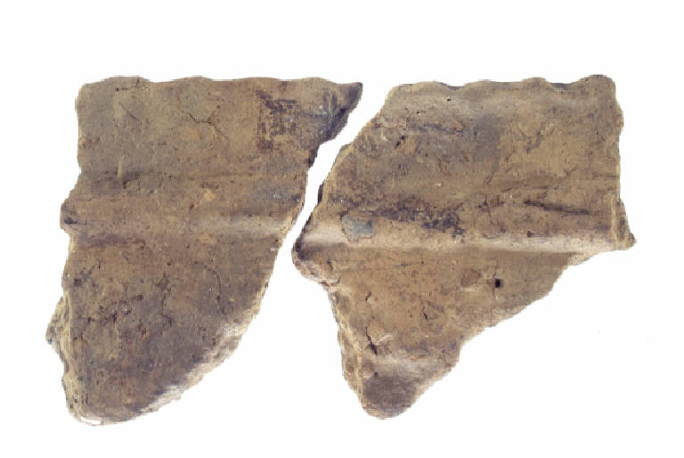 Orlo appiattito, labbro indistinto, corpo ovoide-cilindrico. Sull'orlo impressioni a tacche subcircolari, sulla parete cordone plastico liscio (h. cm.1.4, sp. cm.0.4) a sezione irregolarmente triangolare.