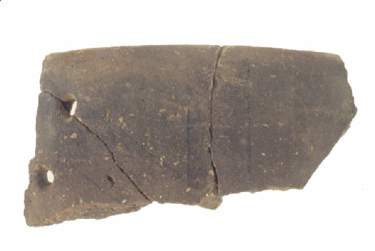 Orlo arrotondato, labbro indistinto, vasca profonda a profilo leggermente curvilineo. Due fori passanti sulla parete (diam. 0.8-0.4 e 0.7-0.4).