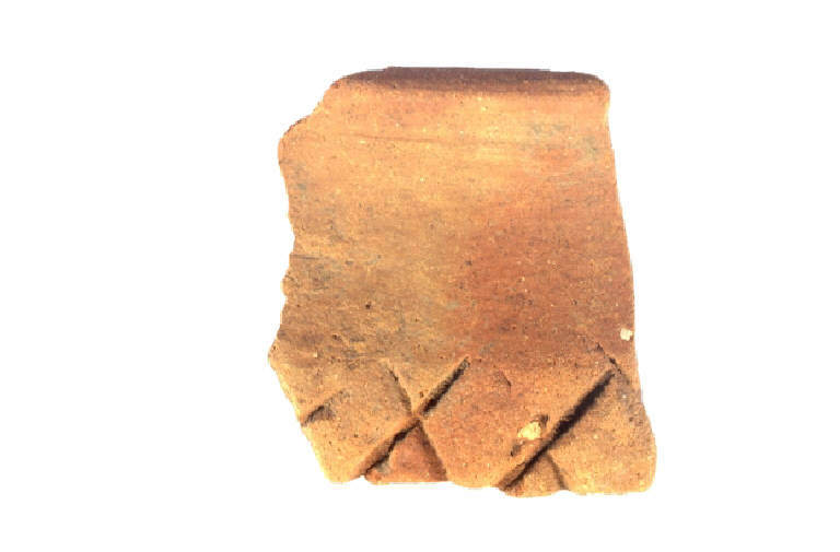 Orlo ingrossato, superiormente appiattito, labbro verticale a profilo rettilineo, spalla poco pronunciata a profilo curvilineo. Incisioni profonde e sottili a reticolo sulla spalla.
