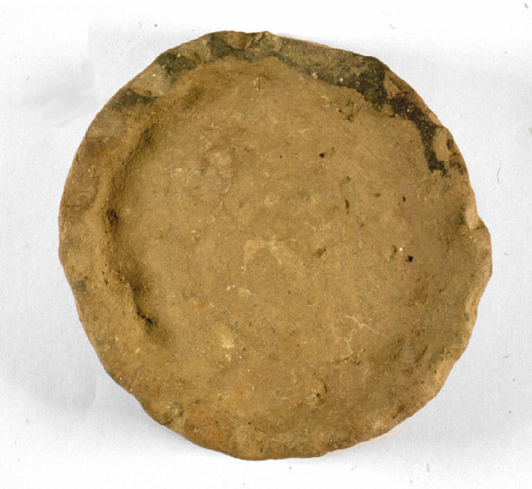 Piede ad anello leggermente troncoconico, spesso fondo piano, attacco della parete. Impressioni a tacche digitali sul piede.