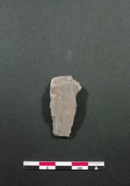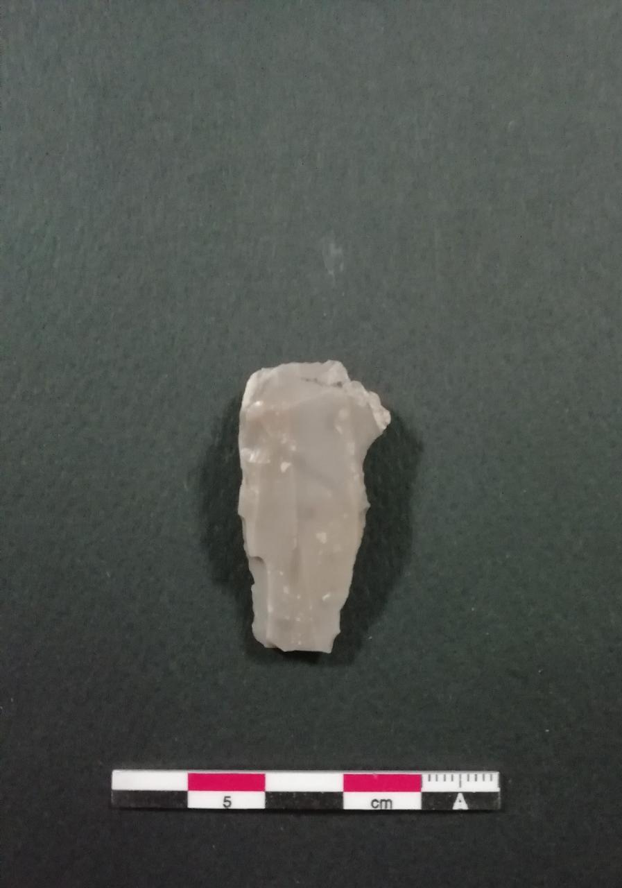 Denticolato (D1) su lama in selce grigia con cortice, frammentata. Ritocco semplice marginale diretto nella parte superiore del lato destro a formare un incavo.