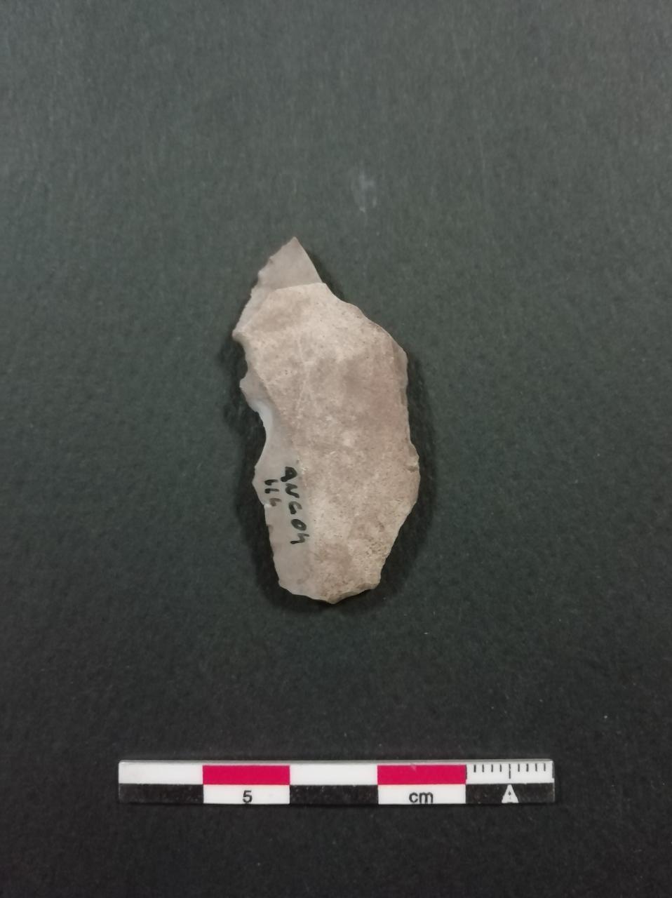 Grattatoio frontale lungo (G1) su lama in selce grigia con cortice. Ritocco erto nella parte distale. Molto frammentario e con tracce di esposizione al calore.