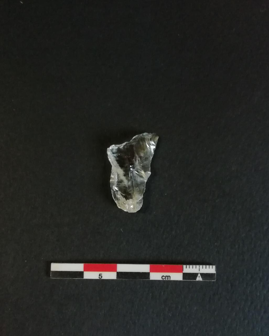Troncatura obliqua (T2) su lama a sezione trapezoidale in quarzo. Ritocco erto nella parte distale obliqua.
