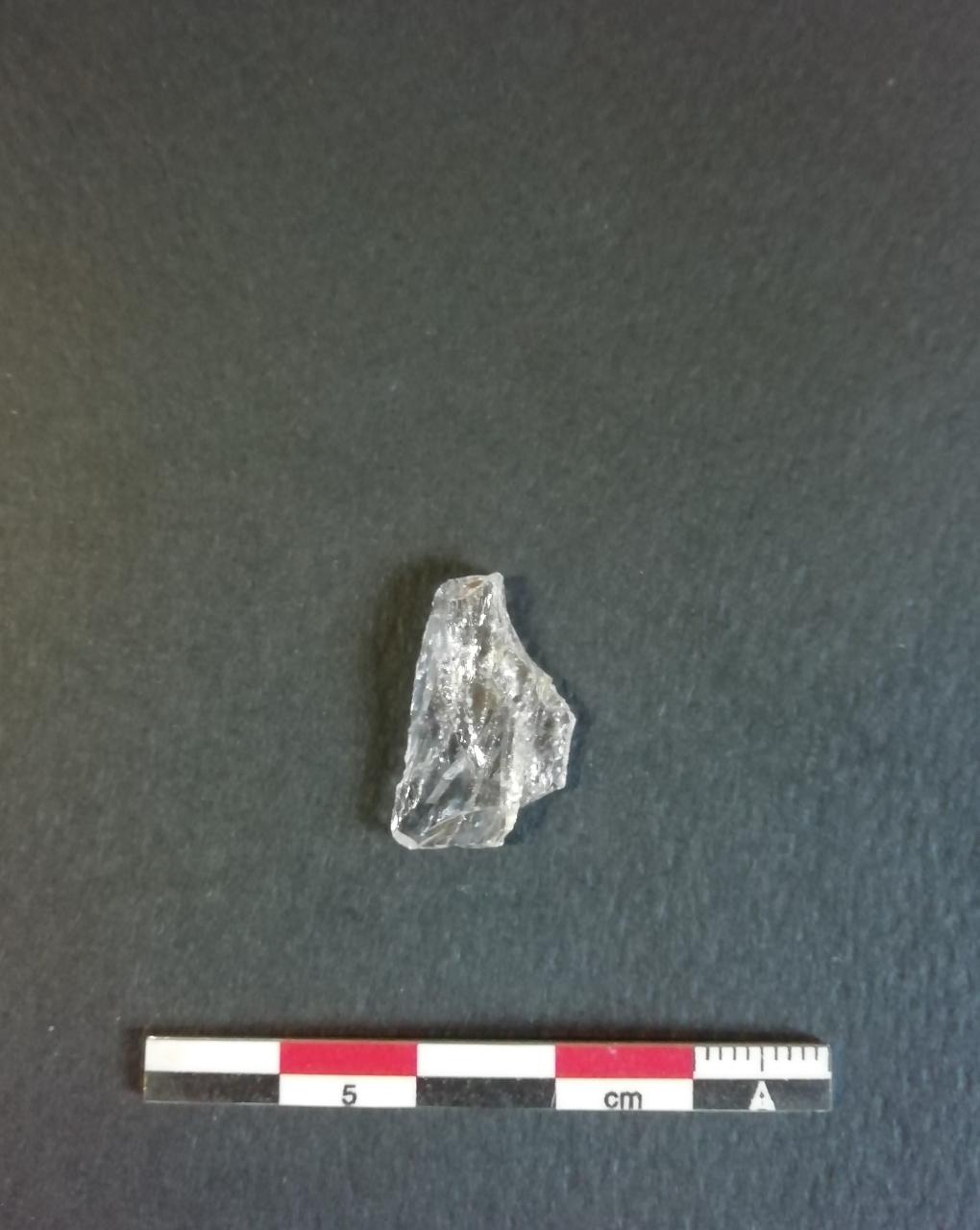 Bulino su ritocco a piano laterale (B6) su lama a sezione triangolare in quarzo, frammentaria. Ritocco erto nella parte distale che intercetta uno stacco di bulino laterale.