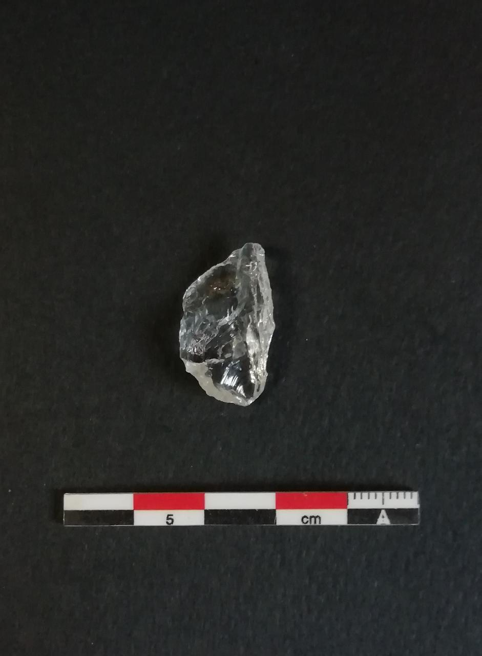 Raschiatoio laterale (R2) su scheggia in quarzo, frammentario nella porzione distale. Ritocco semplice diretto invadente lungo il lato sinistro.