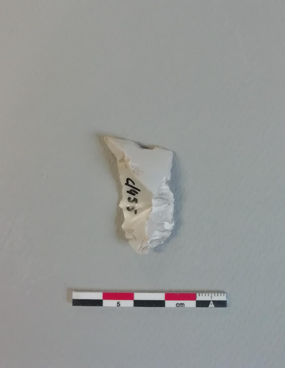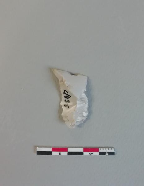 Lama a dorso e troncatura obliqua a angolo acuto (DT3) su scheggia in selce bianca. Ritocco erto sulla troncatura obliqua nella porzione distale, diretto semplice marginale nella parte superiore del lato destro, inverso semplice marginale nella parte superiore del lato sinistro che termina a punta.