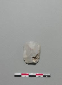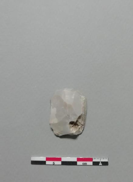 Grattatoio frontale corto (G3 tendente a G9) composto con troncatura (T2) in selce bianca con cortice. Ritocco quasi sopraelevato che determina un fronte regolare molto convesso. La troncatura ben marcata, opposta al grattatoio, è rettilinea appena concava. Piccola scheggia subcarenata (l.c. tipologico 2,4), sagoma asimmetrica.