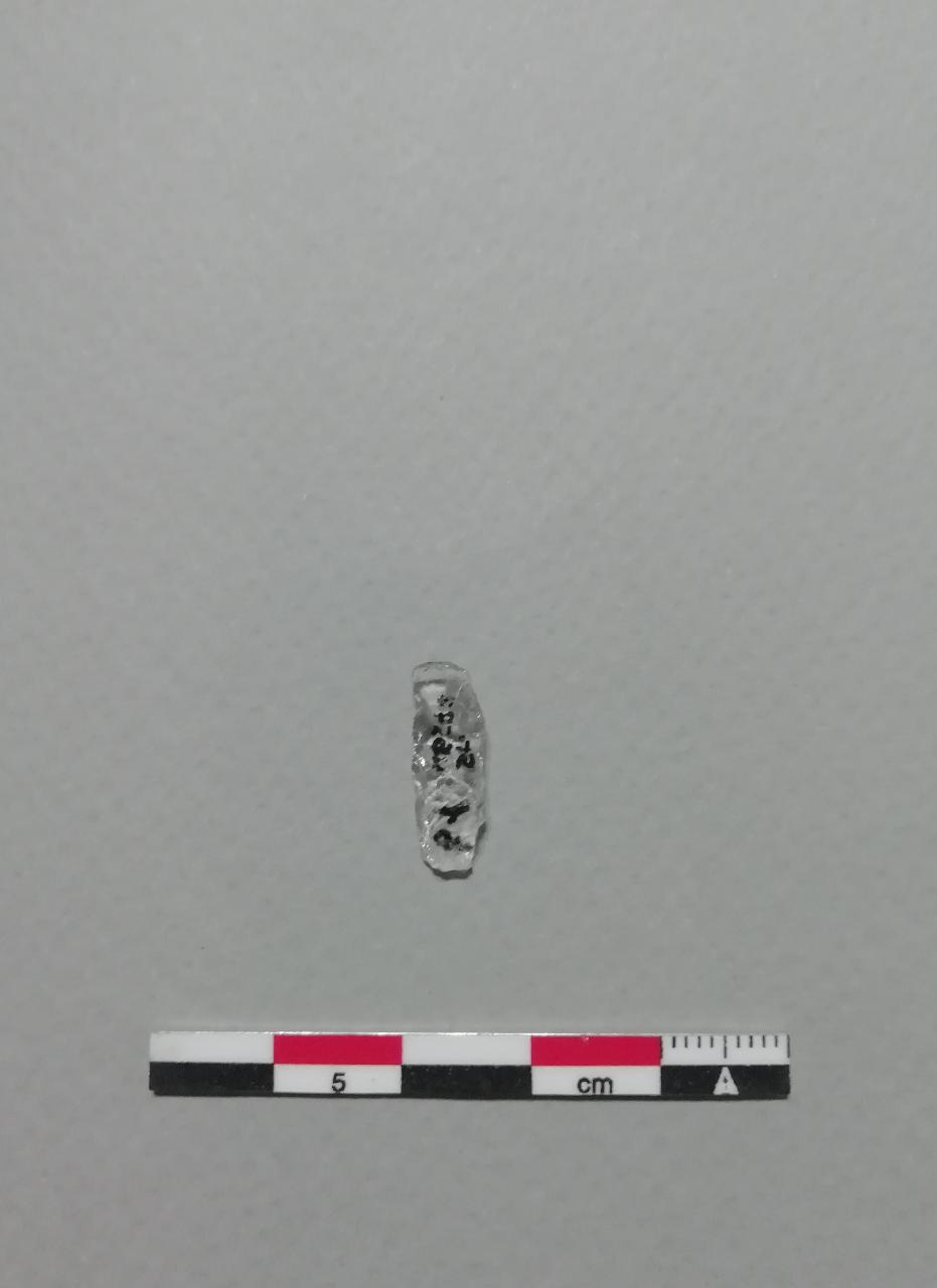 Lama a dorso (LD2) a ritocco unilaterale totale rettilineo. Microlamella stretta piatta, simmetrica, a sezione trapezoidale, in quarzo ialino. Armatura larga.