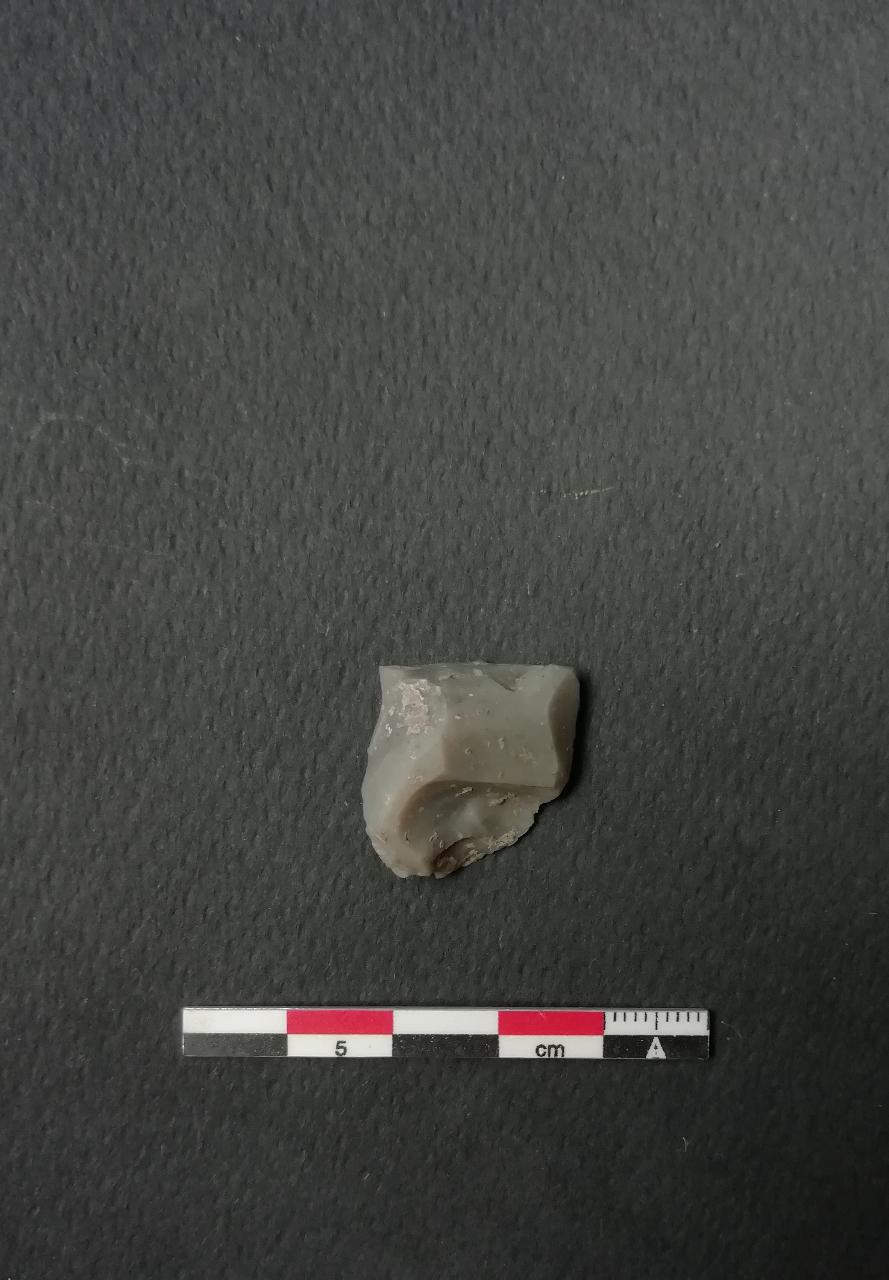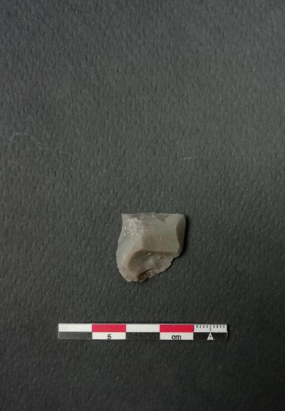 Becco (Bc1) su scheggia in selce grigia. Ritocco erto nella parte distale a formare un becco.