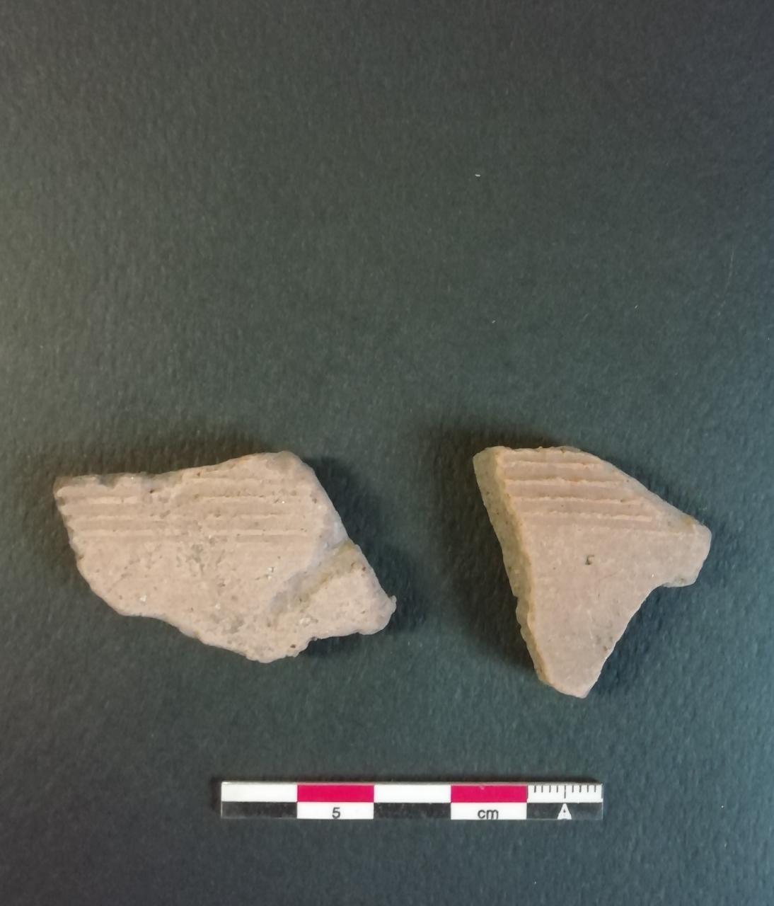 Due frammenti di parete in ceramica semifine, pertinenti, decorati con cinque linee parallele orizzontali ad impressione.