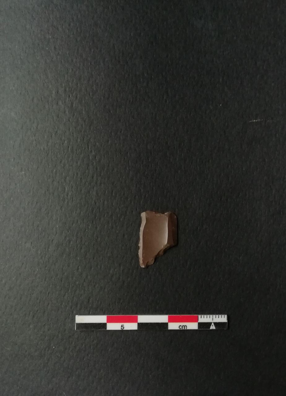 Geometrico trapezio rettangolo (Gm7) su lama in selce bordeaux. Ritocco erto su troncatura normale con incavo nella parte distale e su troncatura obliqua nella parte prossimale.