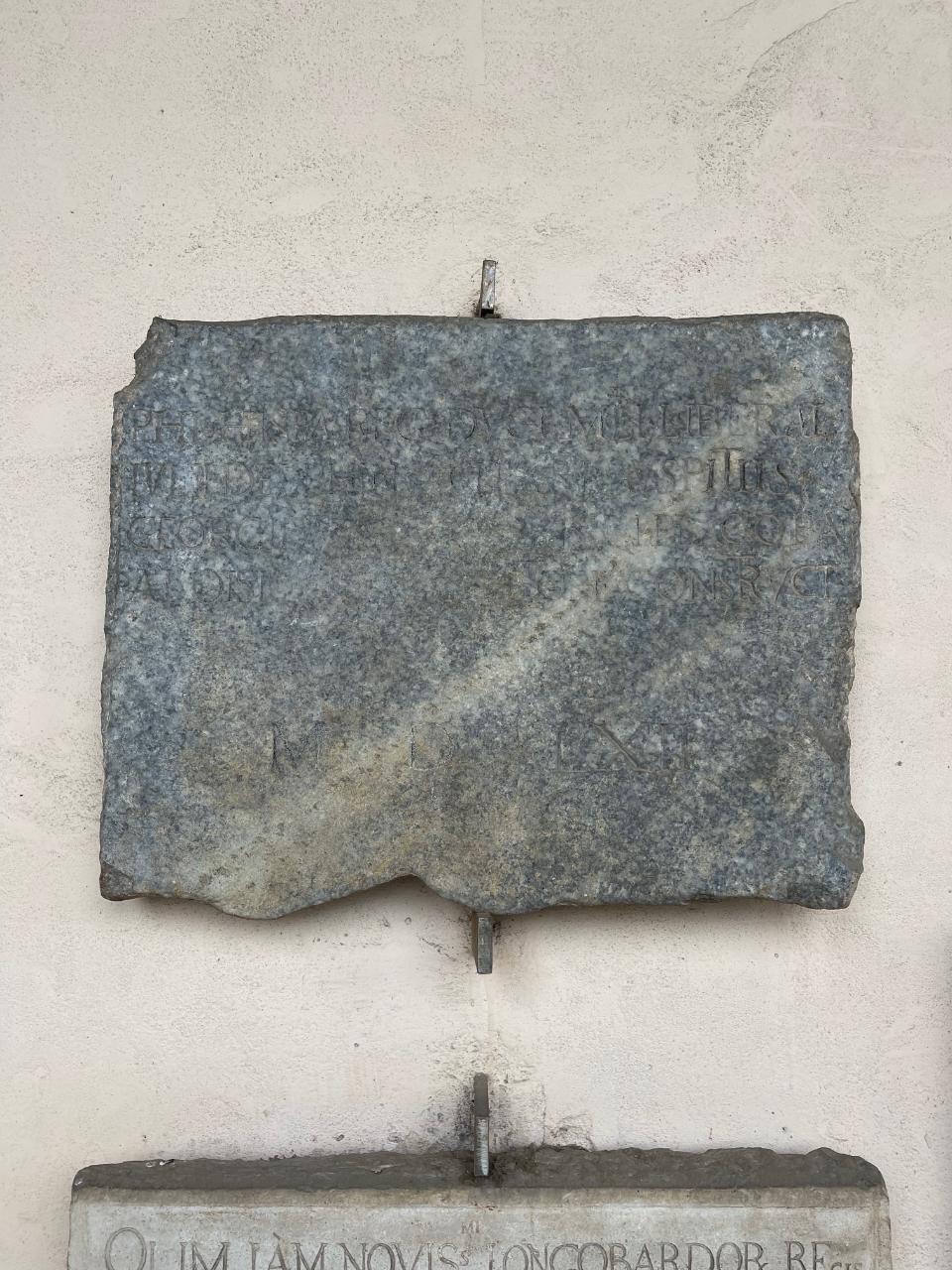 L'iscrizione commemora una costruzione eseguita per libertà di Filippo II d'Asburgo, Re di Spagna e Duca di Milano. I nomi dei vari artefici non risultano più leggibili, ma tra questi compare Giulio Delfino, nativo di Mantova; costui fu professore di filosofia e medicina presso l'Università di Pavia e tra i fondatori dell''Accademia degli Affidati nel medesimo anno riportato sulla lapide. Un'altra figura sembra identificabile con Aloiso Mesa Cortez, senatore di Milano, nonchè Pretore di Cremona e Pavia, sepolto in S. Pietro in Ciel D'Oro.