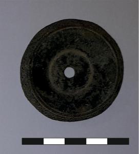 Disco in bronzo di forma circolare forato al centro; probabile elemento di cembalo.