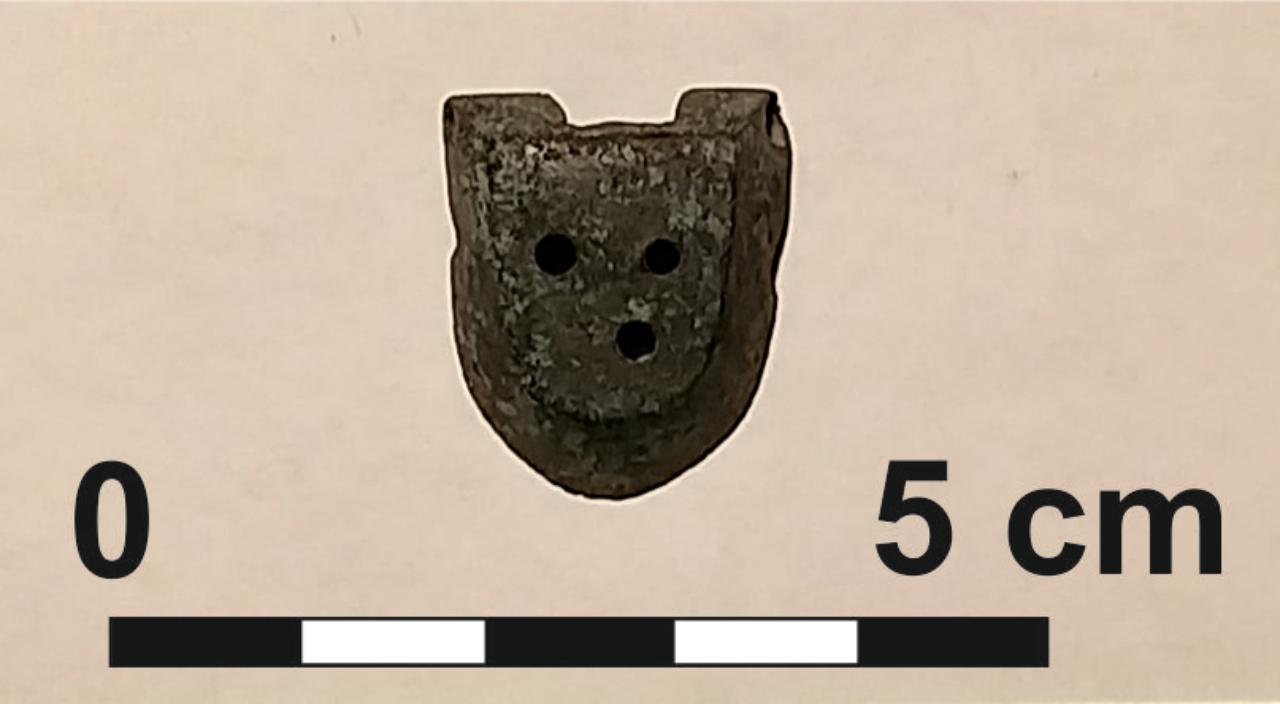 Parte inferiore di scatola per sigillo in bronzo di forma rettangolare con terminazione tondeggiante; presenta 3 fori per il passaggio dei fili di chiusura.