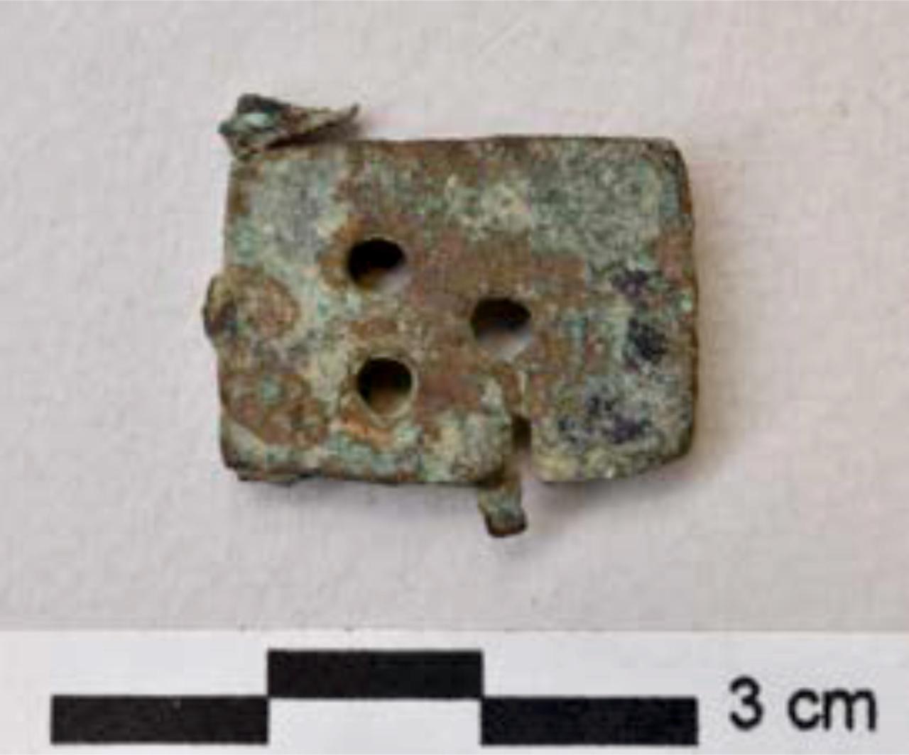 Parte inferiore di scatola per sigillo in bronzo di forma rettangolare con 3 fori per il passaggio dei fili di chiusura.