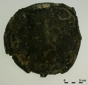 Fondo sostitutivo di situla in lamina di bronzo che doveva essere fissato con una serie di ribattini alle pareti.