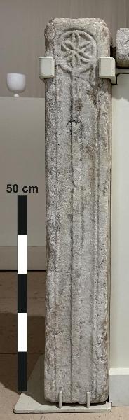 Pilastrino di recinzione presbiteriale in marmo di Vezza d'Oglio. Orlato per tutta la lunghezza da un bordo lineare, presenta una decorazione costituita nell'estremo superiore da una stella a sei punte cave racchiusa entro un cerchio e connessa in posizione mediana a un'asta verticale.