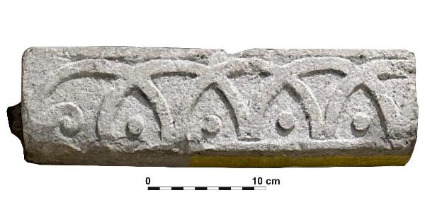 Frammento di cornice per recinzione presbiteriale in calcare con decorazione ad archetti; realizzata per connettersi a un pilastrino di epoca anteriore.