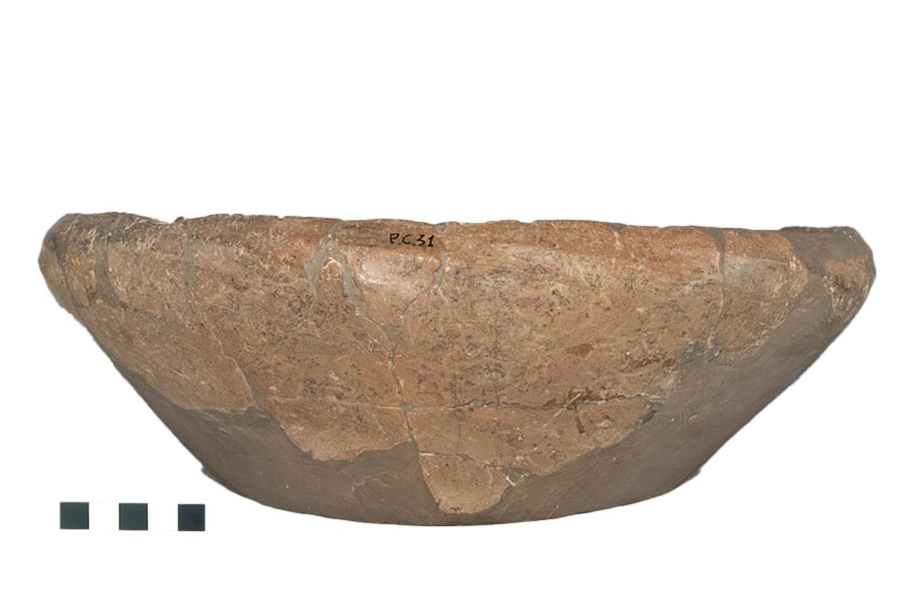 Grande ciotola troncoconica con orlo introflesso e decorazione a costolature oblique. Impasto medio grigio scuro, superficie lisciata opaca grigio beige.