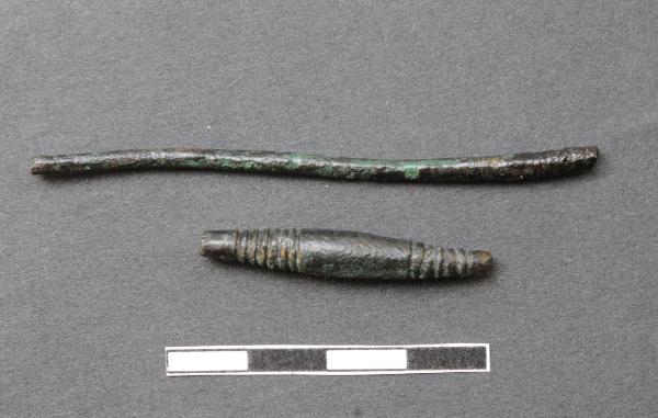 Gambo di spillone a sezione circolare decorato da due fasce di incisioni separate da un tratto liscio.\n