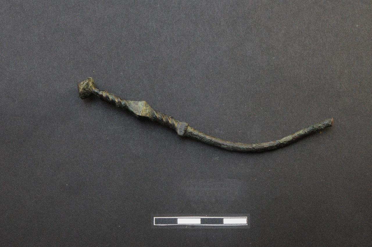 Spillone a testa biconica con collo sfaccettato con parte centrale a sezione quadrata tra due tratti a tortiglione e un altro tratto a sezione quadrata all'innesto col gambo\n