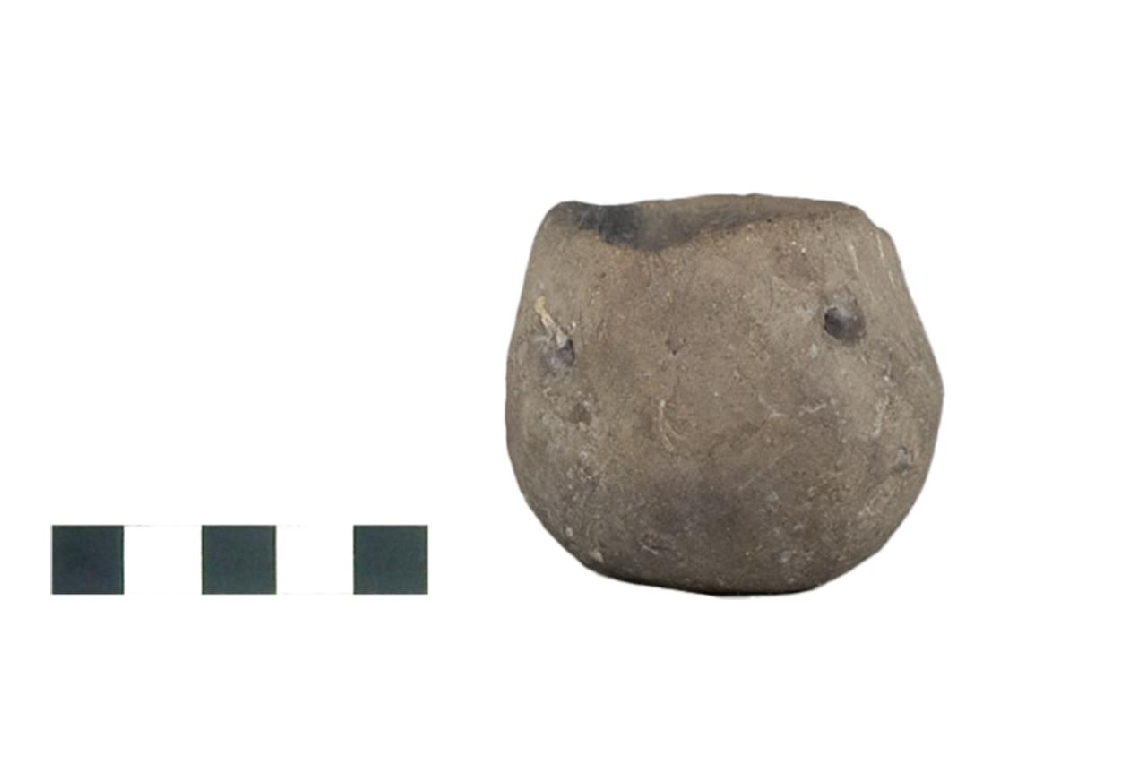 Vasetto a corpo globoso e fondo convesso con 4 fori passanti per sospensione (?). Ceramica di impasto medio, superficie irregolare opaca.
