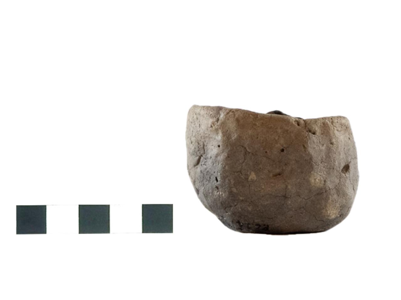 Vasetto a corpo globoso e a fondo piatto. Impasto medio di colore grigio e superficie irregolare opaca.