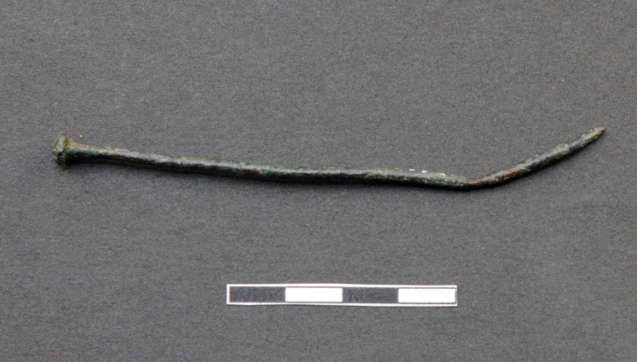 Spillone con capocchia circolare con sommità bombata, con collo non distinto a sezione circolare. La scheda cartacea parla di tracce di decorazione a zig-zag sul collo, ma non sono state rintracciate.