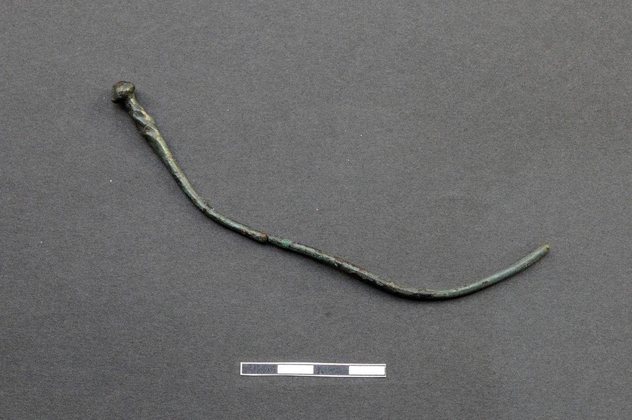 Spillone con grossa capocchia conica, collo leggermente ingrossato con breve tratto con due avvolgimenti a tortiglione. Gambo a sezione circolare di incerta pertinenza.