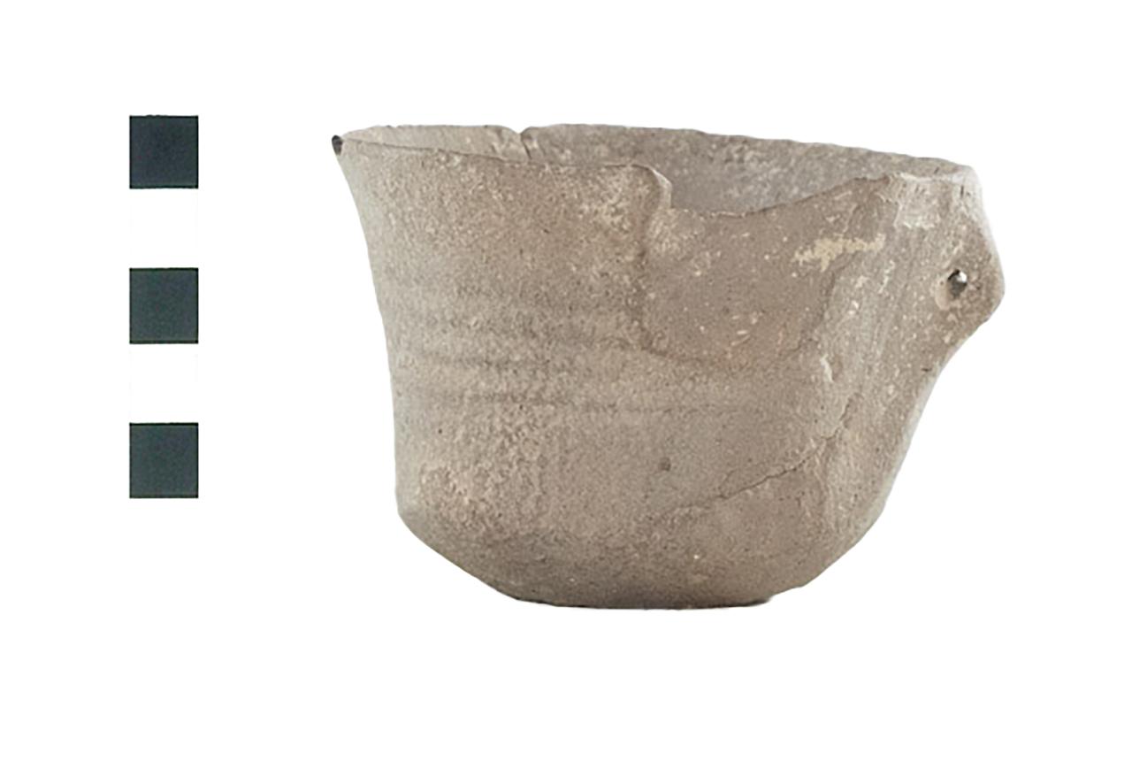 Bicchiere troncoconico con orlo rastremato, parete leggermente concava svasata, bassa carena, fondo convesso e piccola ansa di tipo canaliculato. Decorato con un fascio di solcature orizzontali che creano un motivo angolare presso l'ansa.