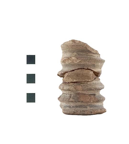 Porzione di incensiere in ceramica d'impasto, colore bruno, parte di alto fusto a costolature.\n