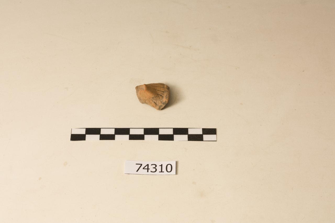 Parte di spalla (?) con attacco di ansa perforata; la porzione di spalla reca cinque tratti incisi di diversa lunghezza e non molto regolari.\n