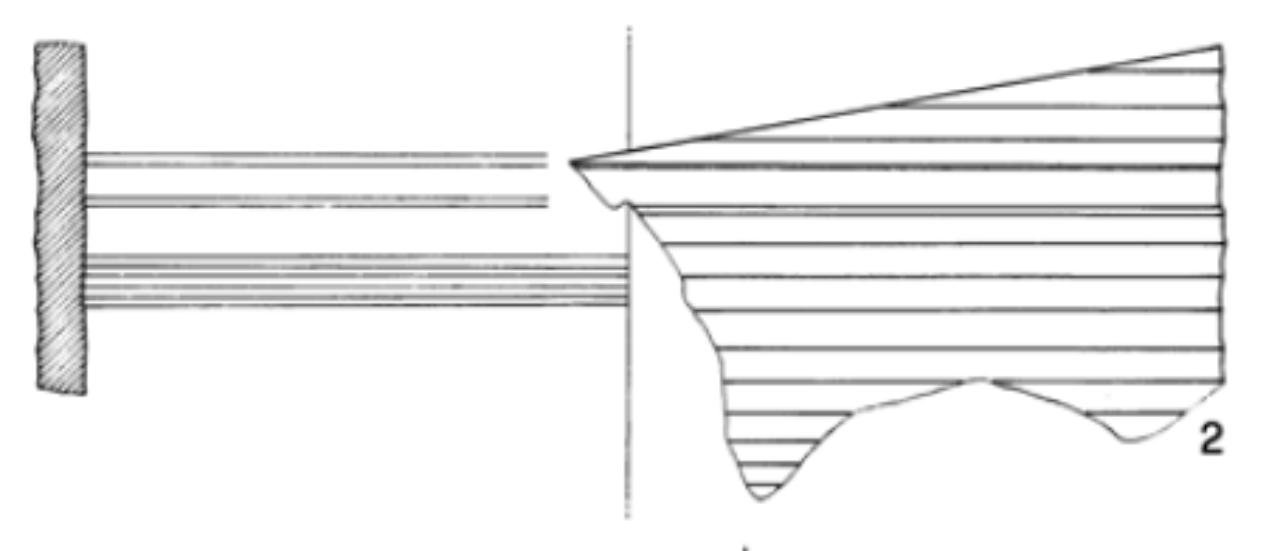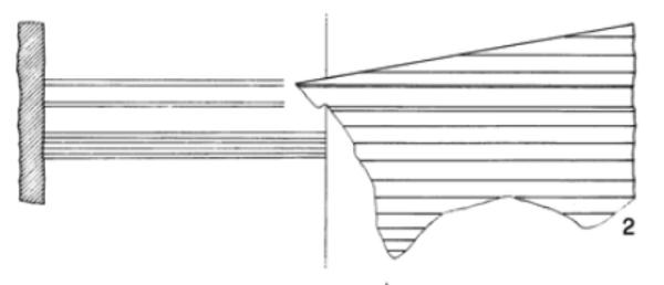 Tipo I.\nRecipiente cilindrico con due cordoni distanziati, tra i quali è inciso il segno VI a rovescio, e un fondo piano, con lievi solcature sulla zona inferiore della parete.