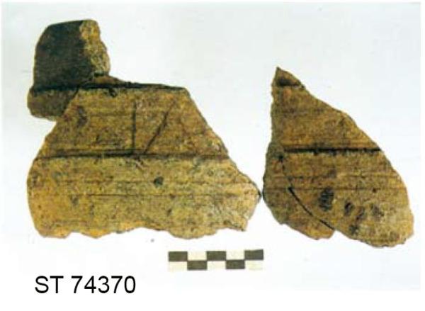 Tipo I.\nRecipiente cilindrico con due cordoni distanziati, tra i quali è inciso il segno VI a rovescio, e un fondo piano, con lievi solcature sulla zona inferiore della parete.