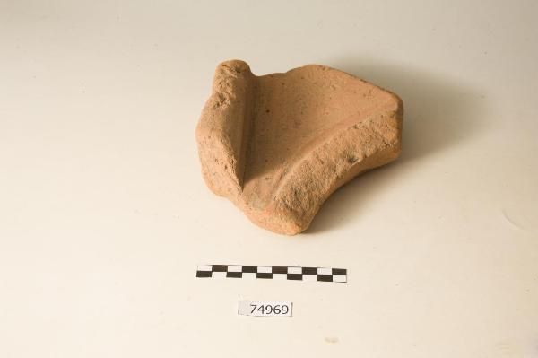 Ampio frammento che conserva un buon tratto di ala laterale, di forma esternamente squadrata, con faccia superiore appiattita e scanalatura all'interno.\nPresenta un'apertura di forma allungata, forse rettangolare a spigoli arrotondati ( lungh. max. cons. 14.5cm, posta a 11.5cm dal bordo della lastra), con segni di lisciatura lungo il margine interno, su cui doveva essere impostato un elemento saliente.