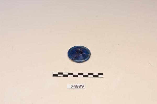 Piede a disco senza bordo distinto.\nPiede ricomposto da numerosi frammenti. Presenta un anello appiattito al bordo non distinto superiormente, all'interno del quale è del materia del vetroso bianco; il piede è piuttosto basso e conserva due costolature applicate (in origine dovevano essere tre) dello stesso colore, che dal gambo arrivano fino al margine.\nIl vetro presenta i segni della rotazione impressa durante la soffiatura e inferiormente la traccia del distacco del puntello.\nLo stelo è del tipo con chiusura a convessità superiore.