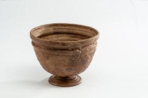 Coppa a calice decorata a rilievo di produzione aretina ricomposto da circa una trentina di frammenti. Decorazione a ovuli, motivi fitomorfi e baccellature verso il fondo della vasca. Due pseudoanse, sagomate a maschere opposte, sono applicate sotto l'orlo. L'unico leggibile dei due bolli in cartiglio rettangolare, in rilievo, presenti sul corpo del manufatto, permette di attribuirlo alla fase bergantea dell'officina di M. Perennis