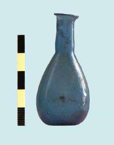 balsamario in vetro soffiato di colore azzurro vivo; labbro estroflesso con orlo tagliato e arrotondato; ventre piriforme, fondo apodo, sottile collo con strozzatura alla base.