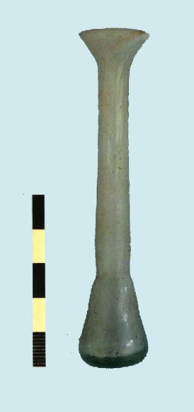 balsamario in vetro soffiato incolore, corpo piriforme e lungo collo tubolare, con leggera strozzatura alla base dello stesso. Labbro tagliato e arrotondato.