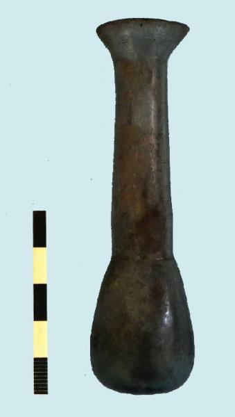 balsamario in vetro di colore azzurro, corpo piriforme e lungo collo tubolare, con leggera strozzatura alla base dello stesso. Labbro tagliato e arrotondato.