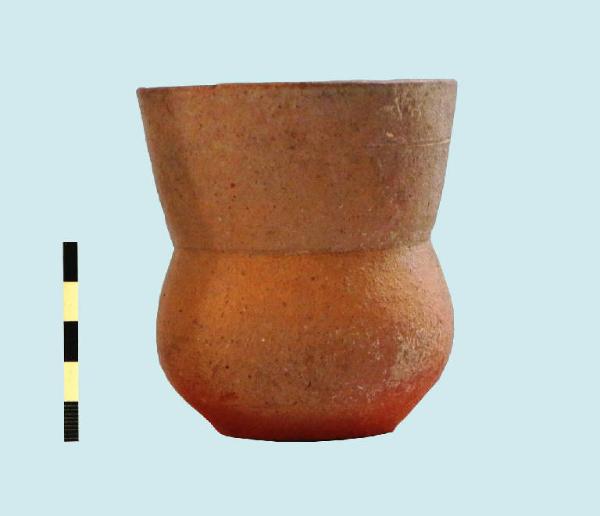 bicchiere a tulipano; corpo globulare, apodo con fondo piano; orlo troncoconico con labbro dritto. L'oggetto ricalca una forma di ascendenza lateniana, molto diffusa in epoca augustea all'interno della produzione di ceramica a pareti sottili.