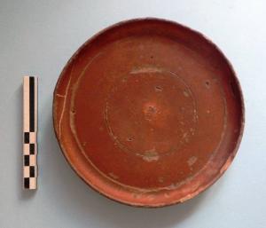 piatto con orlo rientrante, parete liscia arrotondata, piede leggermente svasato con spigolo arrotondato; all'interno due cerchi concentrici incisi, entro i quali, al centro adella vasca si colloca un bollo impresso. sulla parete esterna della vasca in prossimità dell'attacco del piede, si colloca un'iscrizione graffita ad andamento circolare.