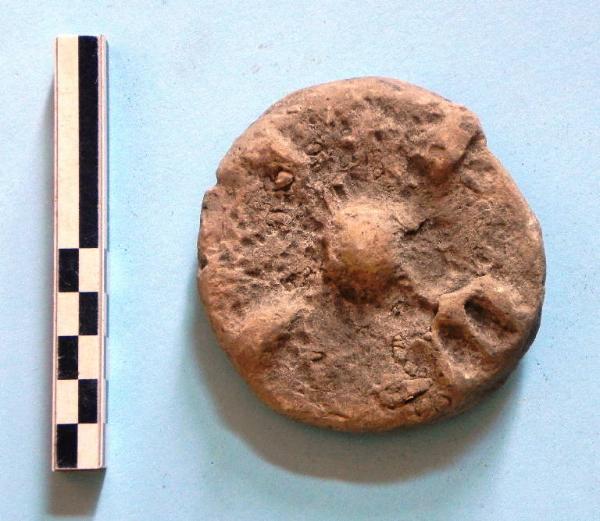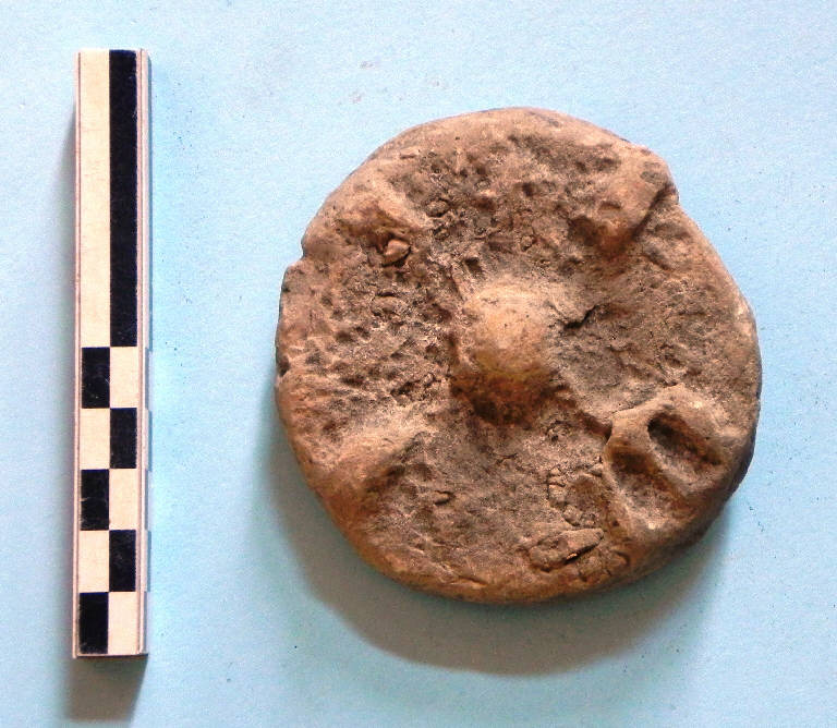 tappo d'anfora di forma circolare a profilo liscio e con presina emisferica centrale; sulla faccia superiore a caratterizzarne la superficie tre piccole protuberanze sub-rettangolari e un tridente, in entrambi i casi realizzati a rilievo.