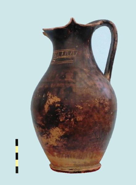 oinochoe in vernice nera con decorazione incisa e e sovraddipinta (Stile di Gnatia); corpo ovoide, rastremato verso il basso, spalla molto inclinata, collo largo, labbro trilobato; piede a disco sagomato, ansa a asezione semicircolare impostata dall'orlo alla spalla.