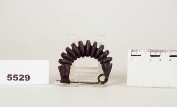 Fibula in bronzo, con arco a grandi coste discoidali e ardiglione diritto. Sulla staffa e i peduncoli dell'ardiglione decorazione a triangoli incisi.