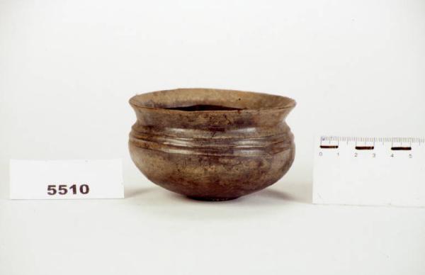 Labbro estroflesso, corpo ovoide, fondo piatto. Sotto il collo due larghe scanalature orizzontali e parallele; sotto il fondo X incisa.