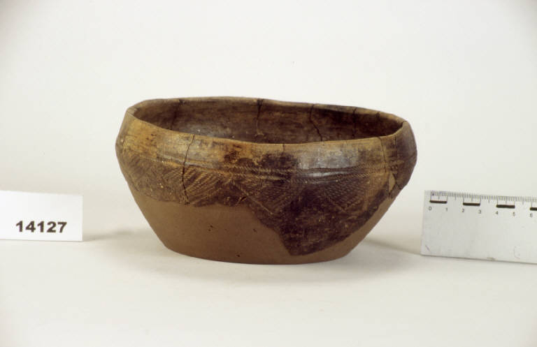 Ciotola coperchio ad orlo rientrante, vasca emisferica. Priva del fondo.\nSotto l'orlo decorazione a denti di lupo e linea orizzontale irregolare a falsa cordicella.