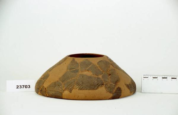 Ciotola coperchio ad orlo rientrante, vasca emisferica. Priva del fondo.\nSotto l'orlo decorazione a denti di lupo a falsa cordicella.
