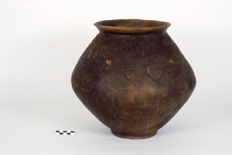Orlo e labbro espansi, corpo biconico, fondo piano. Sulla spalla decorazione a due fasce di denti di lupo intervallati da metope e chiuse inferiormente da una fascia a triangoli capovolti; tutti incisi.